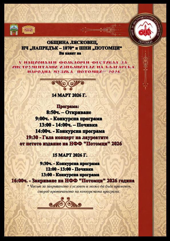 Петото издание на националната изява е насрочено за тази събота и неделя – 14 и 15 март 2026 г. Официалното му откриване е в 08:50 ч. сутринта в първия ден, след което започва конкурсната програма. Надсвирването ще продължи до късно вечерта, а в 19:30 ч. в събота ще се състои Гала-концерт на лауреатите. Музика ще огласява читалището домакин и в неделния ден, който е една специална дата в историята на града ни – на 15 март се навършват 146 години от съществуването на Лясковец като град. Какъв по-хубав подарък за лясковчани от един такъв истински български празник на духа!