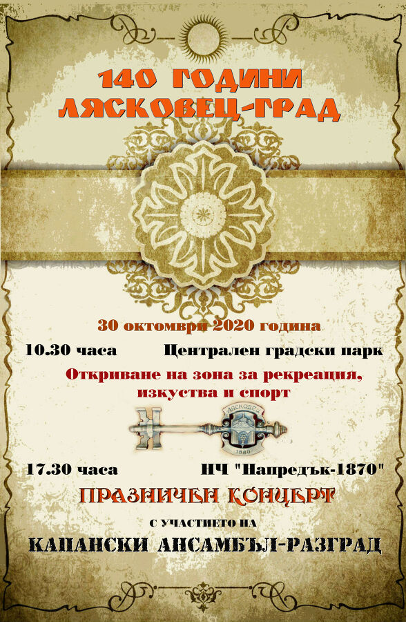 В навечерието на Деня на будителите отбелязваме 140 години Лясковец град 22.10.2020 В навечерието на Деня на будителите отбелязваме 140 години Лясковец град Тази година през март месец се навършиха 140 години от обявяването на Лясковец за град. По повод кръглата годишнина Община Лясковец бе организирала честване, което не можа да се състои. Закъснялото отбелязване на събитието ще бъде в навечерието на един от най-българските празници – Денят на народните будители. Ден преди първи ноември, на 30 октомври, ще протекат няколко празнични прояви. От 10:30 часа гордите жители на четиринадесет десетилетния Лясковец ще открият най-новата и модерна зона в града си - обновените пространства в горното ниво на Голям градски парк. След срязването на лентата ще бъде отслужен и водосвет за здраве и благоденствие за жителите на Лясковец, а деца от Спортен клуб по ориентиране „Браун тим“ ще направят демонстрация с велосипеди по новоизграденото маунтин байк трасе и по скейтборд рампата, както и зигзагообразно преминаване с тротинетки. В същия празничен ден, жители и гости на Лясковец ще могат да разгледат и фотоизложбата „Лясковец през годините“, която ще бъде разположена във фоайето на читалището. На 30 октомври от 17:30 часа в салона на читалище „Напредък-1870“ започва и празнична литературно-музикална вечер при 50% заетост на местата от публиката. След поздравителното слово на кмета д-р Гецова, лясковчани ще бъдат зарадвани с подарък от общинското ръководство – празничен концерт с участието на гост-изпълнител „Капански ансамбъл Разград“.
